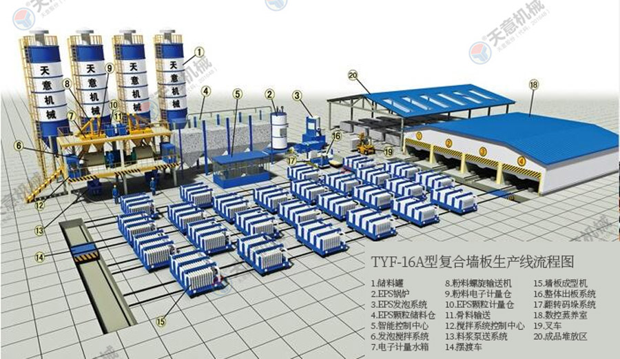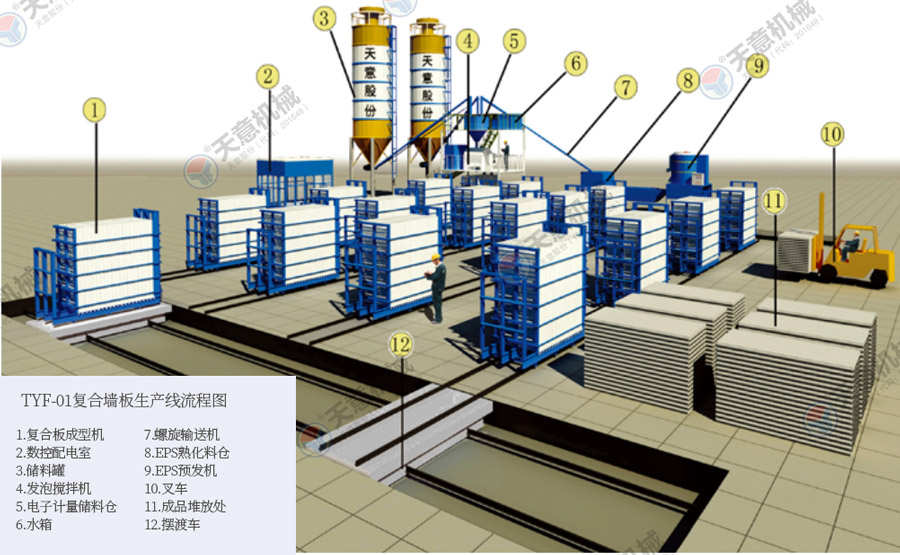TY12型墻板生產(chǎn)線包括:墻板成型機(jī)、整體穿抽管系統(tǒng)、發(fā)泡系統(tǒng)、水箱、電子計(jì)量?jī)?chǔ)料倉(cāng)、螺旋上料輸送機(jī)、儲(chǔ)料罐、螺旋輸送機(jī)、EPS熟化料倉(cāng)、硫化干燥床、EPS預(yù)發(fā)機(jī)、數(shù)控配電室、發(fā)泡攪拌機(jī)、整體出板系統(tǒng)、叉車(chē)、成品堆放區(qū)、擺渡車(chē)。