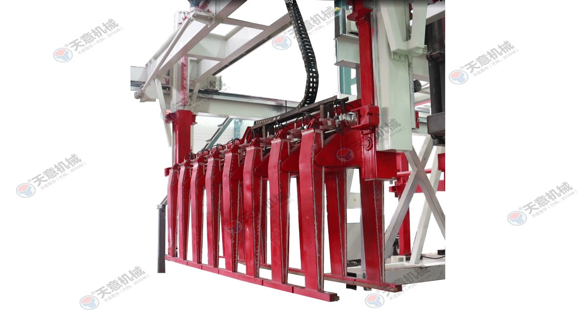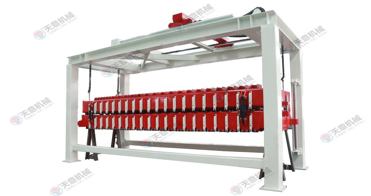 成品分垛吊機(jī):將蒸養(yǎng)車上的一模坯體吊運(yùn)至掰板輸送機(jī)上,然后將空側(cè)板吊運(yùn)至蒸養(yǎng)車上;切割工段空翻脫模機(jī)將模框翻轉(zhuǎn)90°,放在切割小車支座上進(jìn)行脫模,脫模后的??蚺c清理后的側(cè)模板進(jìn)行合模,合膜后的空模框被吊...