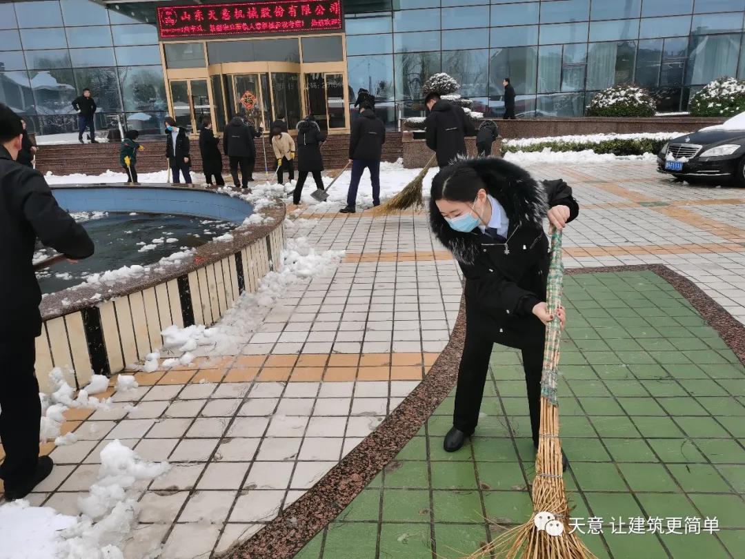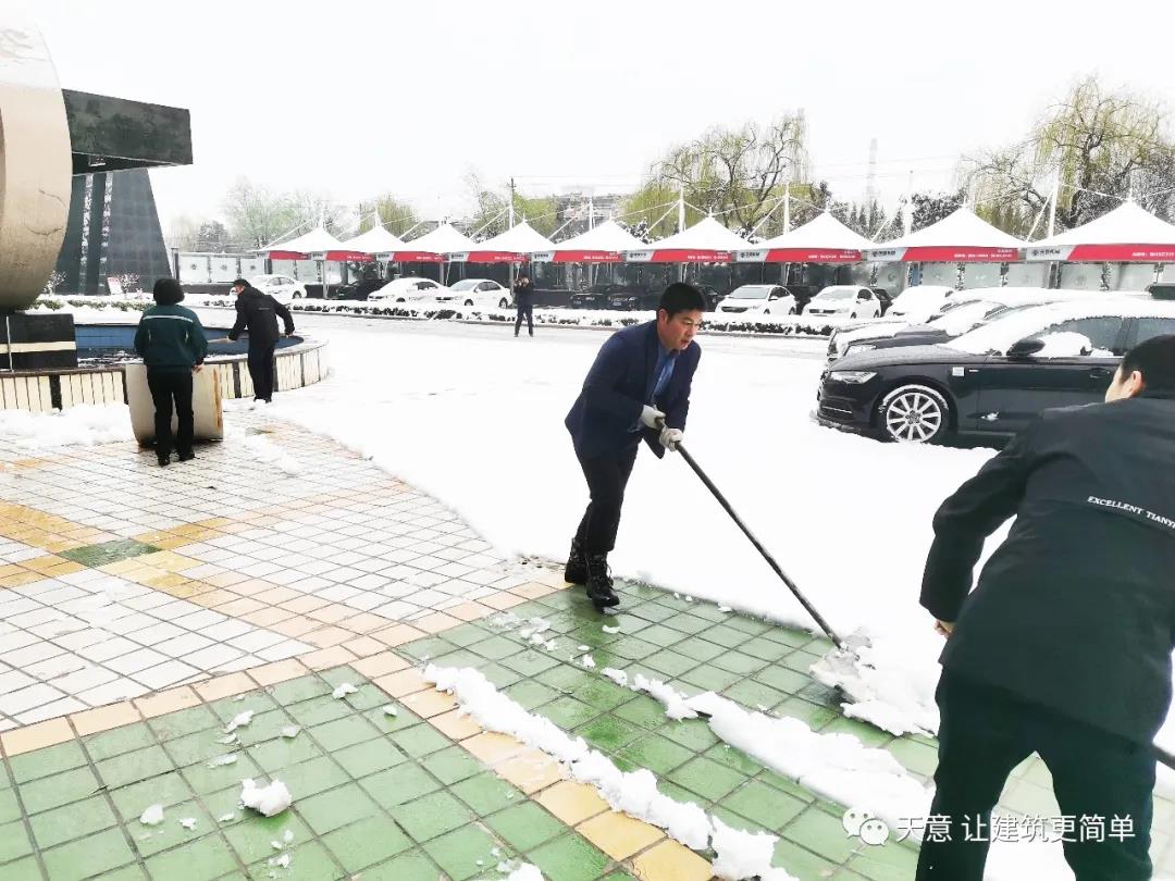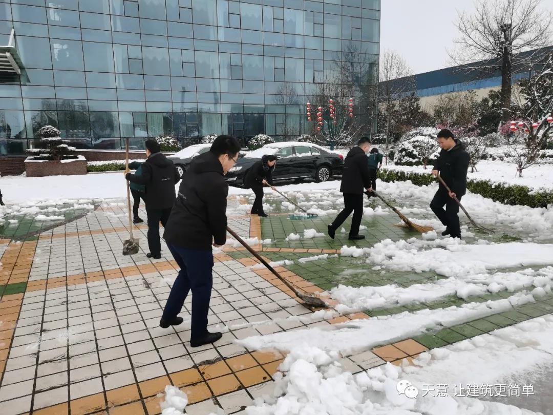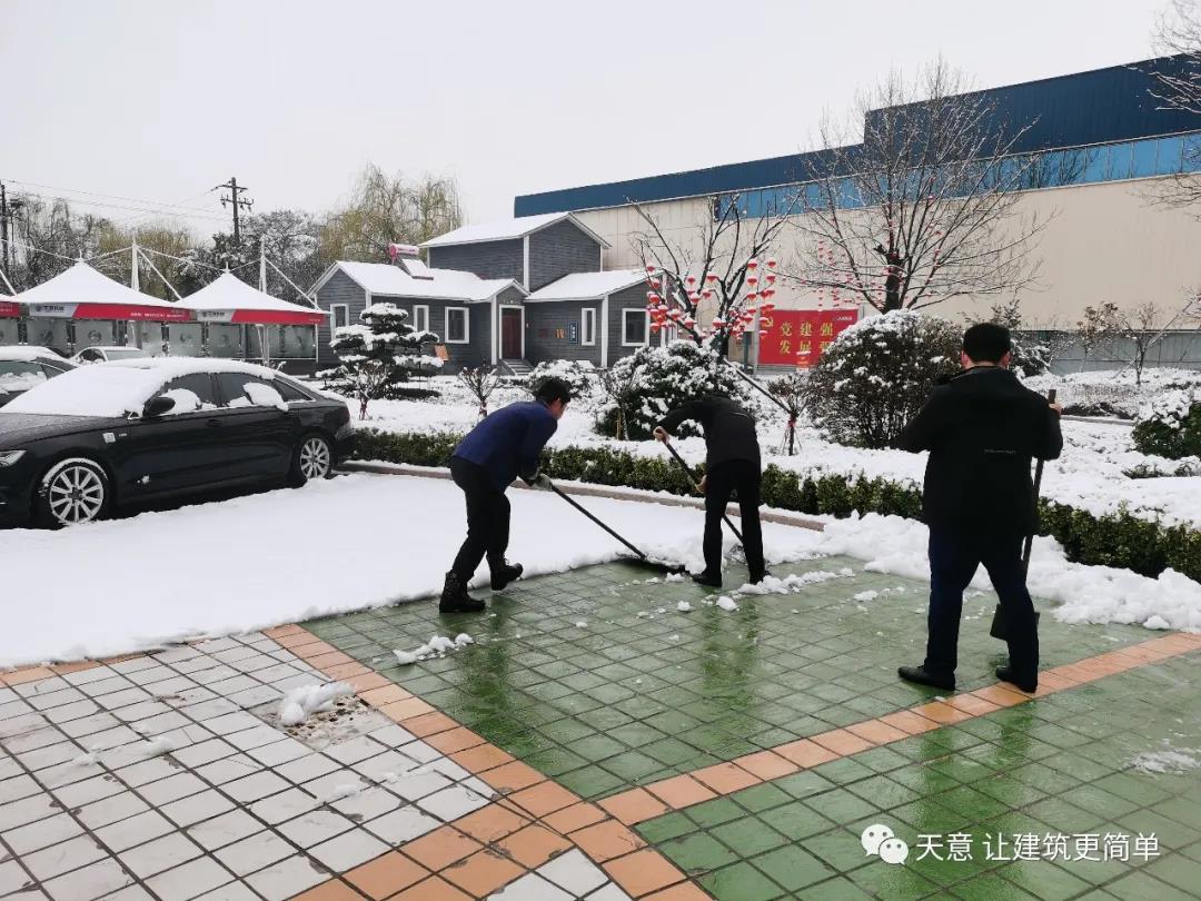 大雪悄然而至,一覺(jué)起來(lái),窗外已是銀裝素裹。然而大雪的降臨也給大家的出行帶來(lái)諸多不便,公司大門(mén)口、辦公樓前的道路都被皚皚白雪覆蓋。早晨上班前,公司總經(jīng)理劉海龍、營(yíng)銷(xiāo)總監(jiān)郭川東帶領(lǐng)公司員工拿起掃帚鐵锨,滿(mǎn)懷激情,投入除雪當(dāng)中。整個(gè)除雪作業(yè)過(guò)程井然有序,熱火朝天,干勁十足,大家不懼寒冷,不怕手凍。鐵锨和地面的碰擊聲、掃帚清掃雪花的刷刷聲,不一會(huì)兒辦公樓前的積雪已蹤影全無(wú),所到之處,雪沒(méi)了,路干凈了,掛滿(mǎn)枝頭的冰凌隨風(fēng)婆娑起舞,點(diǎn)頭稱(chēng)贊,大家的心中更是無(wú)比的欣慰,雖然凍紅了臉、累出了汗,但累并快樂(lè)著。