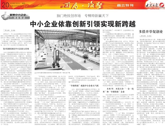 2015年1月25日的大眾日?qǐng)?bào)?兩會(huì)特刊《獨(dú)門(mén)絕技創(chuàng)市場(chǎng) 專精特新贏天下――中小企業(yè)依靠創(chuàng)新引領(lǐng)實(shí)現(xiàn)新跨越》重點(diǎn)介紹了我公司技術(shù)創(chuàng)新的經(jīng)驗(yàn),敬請(qǐng)關(guān)注。